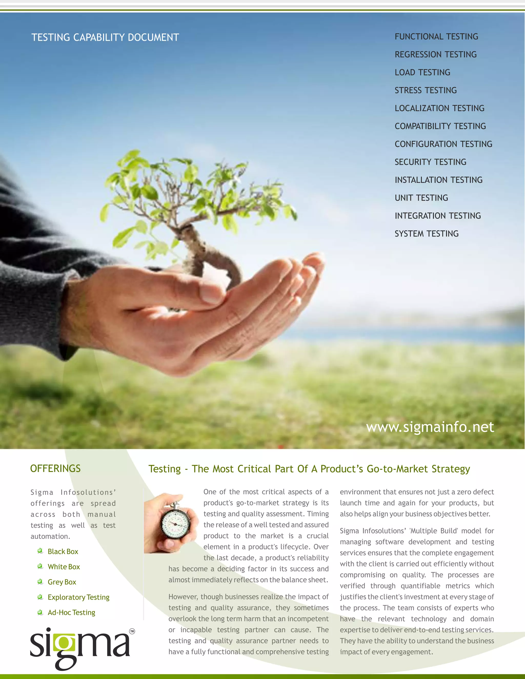 The document discusses the importance of thorough testing and quality assurance for product success. It introduces Sigma Infosolutions as a testing partner that can provide a comprehensive testing environment and process to ensure zero defects in product launches. Sigma uses a "Multiple Build" engagement model where requirements are implemented and tested incrementally in multiple builds to deliver the product faster while incorporating customer feedback. The document outlines Sigma's testing capabilities and services across various domains and technologies. It provides examples of projects they have worked on, including testing an online order management system and providing end-to-end testing for an antiques auction portal.