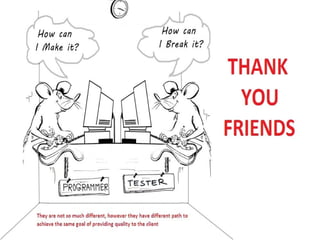 Testing involves finding errors in a program. The goal is to assume a program contains errors and test to find as many as possible. Different testing techniques include white box testing by developers and black box testing by testers. Testing levels include unit, integration, system, and user acceptance testing. Developers and testers have different goals - developers want code to work while testers try to make code fail. Good development practices from a tester's view include doing own acceptance tests, fixing bugs, writing helpful error messages, and not artificially adding bugs. Good relationships between project managers, developers and testers help ensure quality.