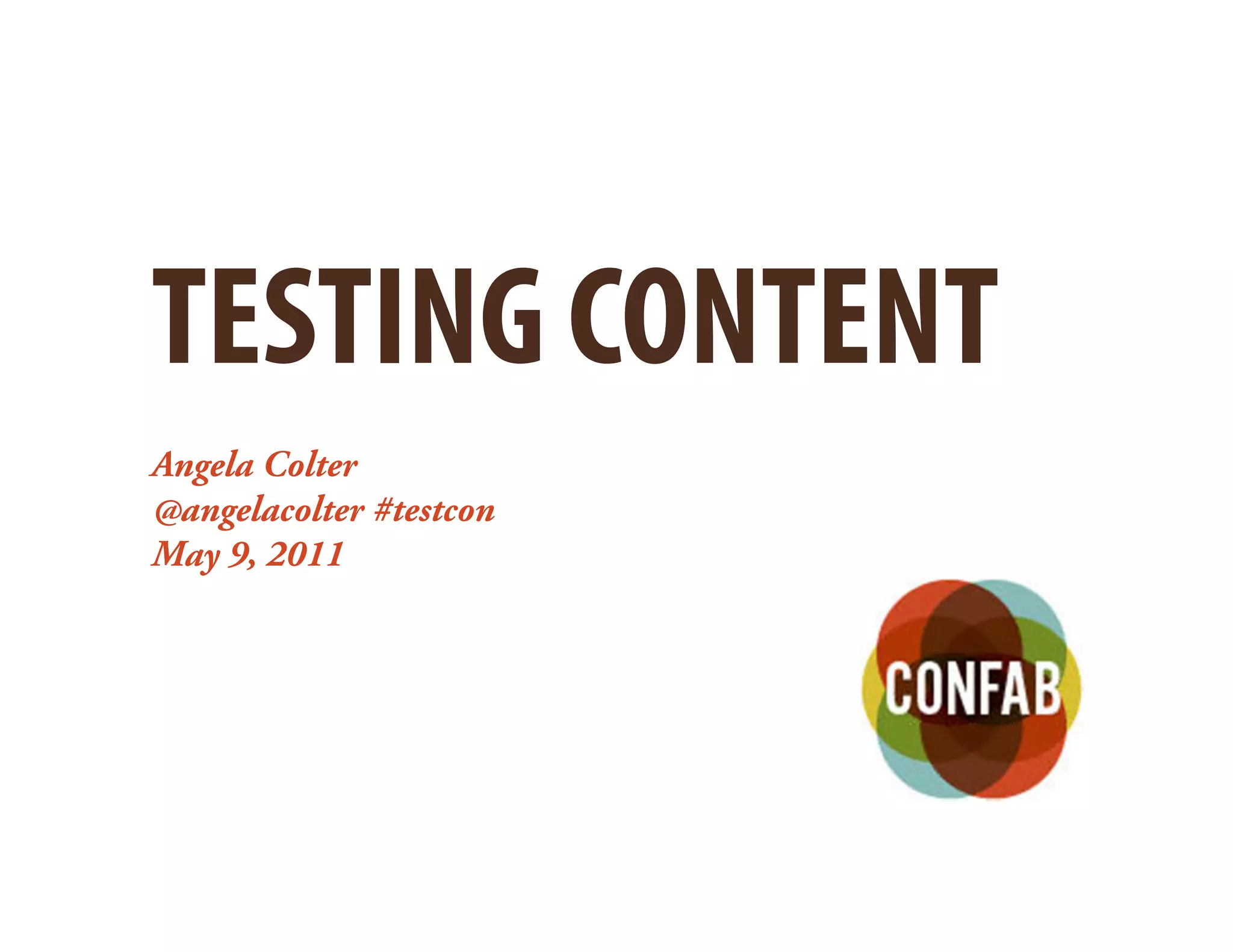 The document discusses different methods for testing content, including readability formulas, cloze tests, and usability testing. It provides details on how to conduct each type of test, what each tests, their benefits and limitations. Readability formulas quickly estimate text difficulty but should not be the only evaluation method. Cloze tests indicate appropriateness for an audience and take little time. Usability testing directly observes users and is most effective but also most resource-intensive. The document recommends using multiple methods of testing for comprehensive evaluation of content.