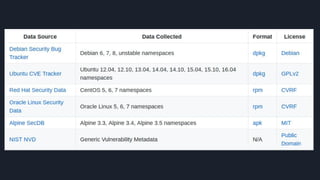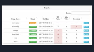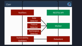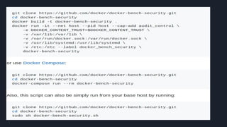 This document discusses tools and best practices for auditing Docker images for security. It begins with an introduction to Docker security concepts like namespaces, cgroups, and capabilities. It then discusses tools like Docker Security Scanning, Clair, Docker Bench Security, and Lynis that can be used to audit images. The document provides checklists for building secure Dockerfiles and consuming images. It concludes with recommendations around signing images, pinning dependencies, and using content trust and least privilege configurations.