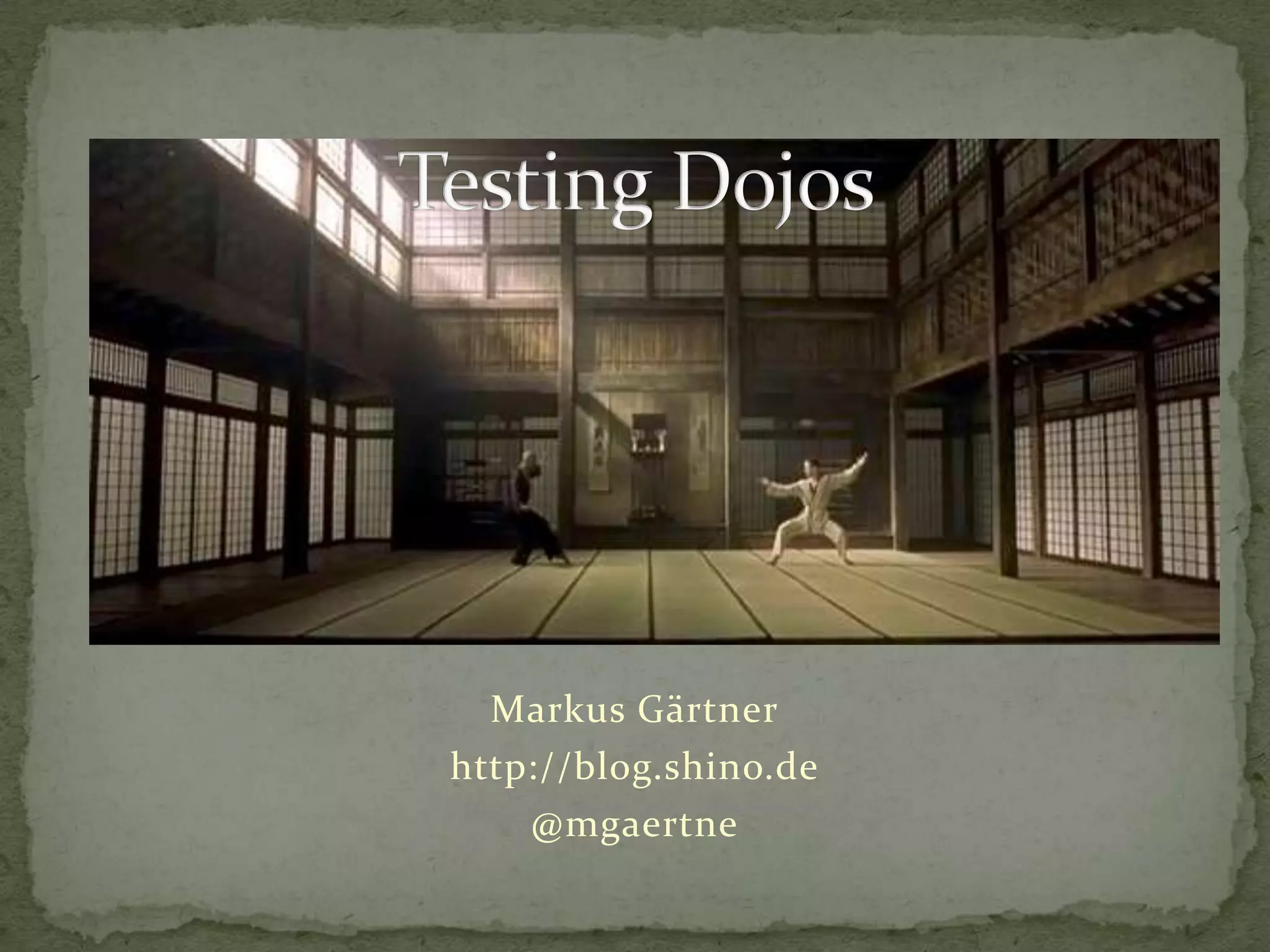 TestingDojos are collaborative testing sessions similar to coding dojos where participants work together through deliberate practice to improve testing skills. A testing dojo requires a meeting room with computers, a projector, and materials like paper, pens, and a whiteboard. Sessions can be single, paired, or involve missions where participants test something or evaluate tools together to learn new approaches and support team building, motivation, and breaking up routine work.