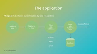 The document discusses testing face authentication on mobile applications. It identifies key areas to test such as validating the machine learning algorithm's correctness, testing across different devices and conditions, and automating the face capture flow. It provides examples of data parameters and scenarios to test, approaches to source test data and validate the algorithm, and methods to test the application functionality including using real or virtual devices and automation tools. The goal is to thoroughly test critical areas of quality concerns for the face authentication application.