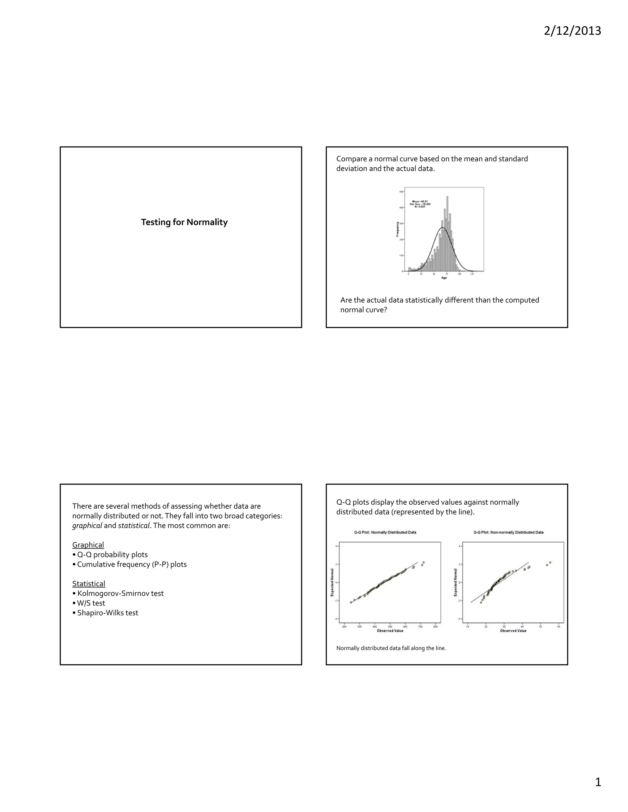 This document discusses methods for testing whether a data set is normally distributed. It describes both graphical and statistical tests for normality, including Q-Q plots and the Kolmogorov-Smirnov, Shapiro-Wilk, and Lilliefors tests. It then provides a detailed example of how to perform the Kolmogorov-Smirnov test for normality on a set of height data.