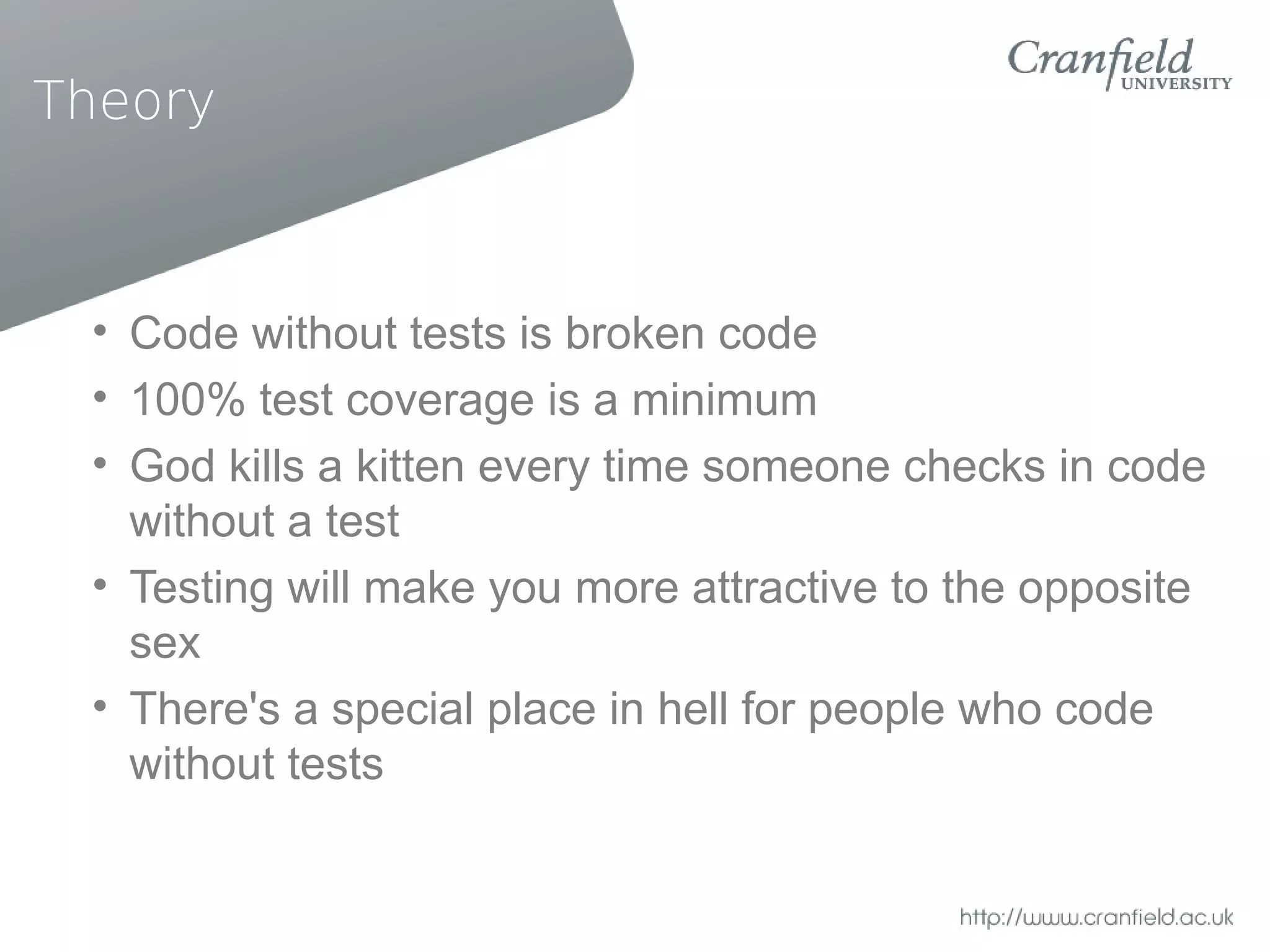 This document discusses testing practices for pragmatic developers. It argues that while testing is important, it should be done pragmatically by focusing on value over completeness. Unit, integration, mock and other types of tests are described along with test frameworks and best practices like test-driven development. The document emphasizes that testing needs to balance costs and value.