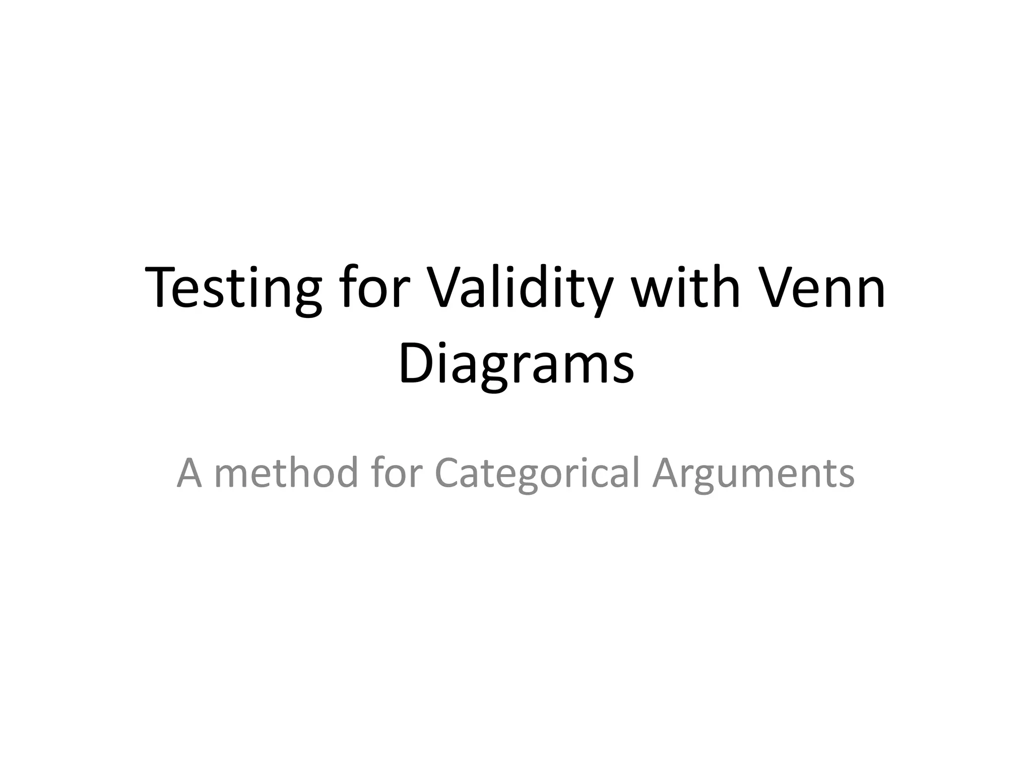 2) Venn diagrams represent categorical statements using circles to represent categories. Validity is determined by whether the conclusion is already contained within the representation of the premises.