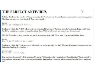 The document discusses the methodology and challenges in heuristic detection of malware, emphasizing the importance of repeatability, validation, and ethical practices. It critiques the reliance on outdated samples and the misleading nature of rapid update frequencies in antivirus products, suggesting that quick updates do not necessarily equate to better protection. Additionally, it underscores the need for a robust statistical approach in evaluating product performance and highlights the limitations of user-dependent detection systems.