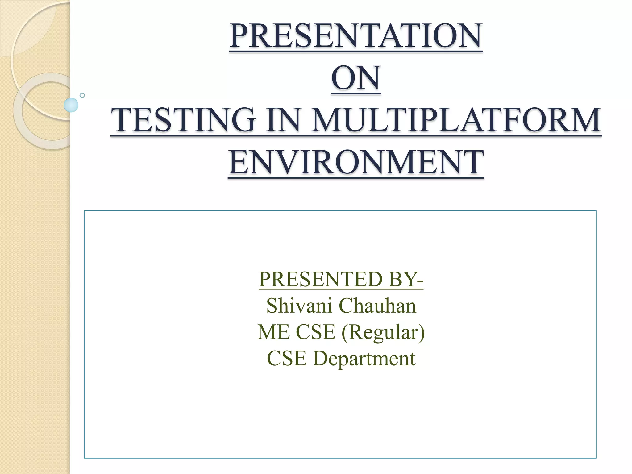 The document presents a comprehensive overview of testing software in a multiplatform environment, highlighting the need for thorough validation and the challenges that testers face. It outlines a seven-step software testing process and a six-task process specifically for multiplatform scenarios, detailing key activities such as risk analysis, verification, validation, and acceptance testing. The document emphasizes the importance of identifying potential errors, assessing platform configurations, and executing tests to ensure consistent performance across different platforms.