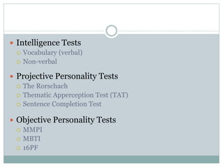 - Various psychological tests are used for employee selection, including personality, honesty, intelligence, aptitude, and physical tests.
