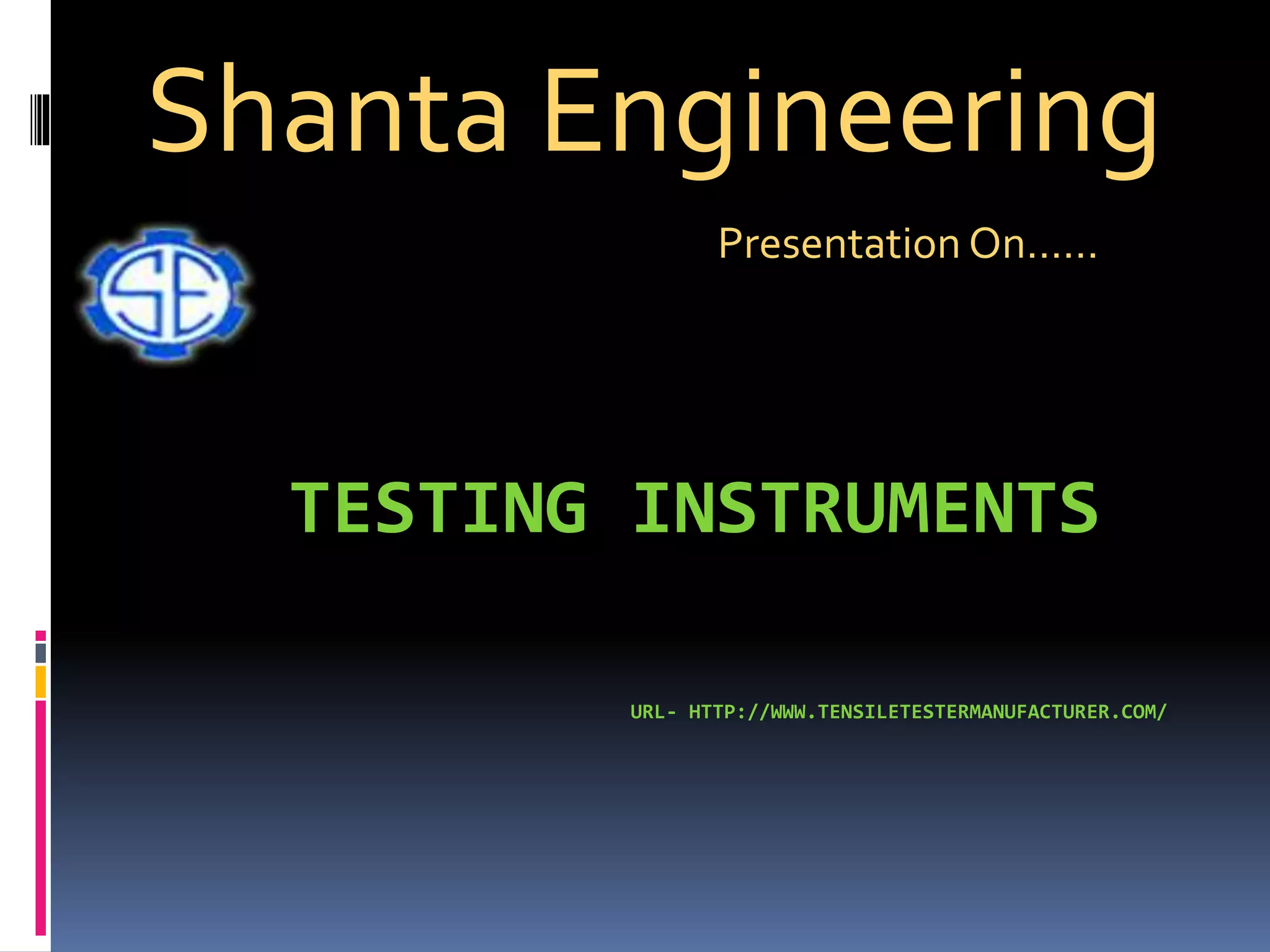 The document describes various tensile testing instruments manufactured by Shanta Engineering, including hand operated, twin column universal, single column universal, and electronic tensile testing machines. The machines can test materials like rubber, plastics, cables, leather, paper, and metals under tension, compression, bending or flexural loads. Key features include digital load and displacement readouts, adjustable speeds, optional load cells and accessories for specific tests. Specifications include load capacities, resolutions, speeds, dimensions and power requirements.