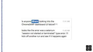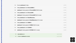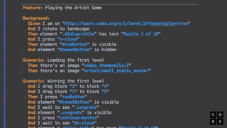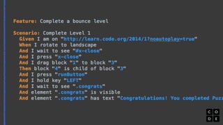 Brian Jordan discusses testing challenges for Code.org's interactive computer science curriculum. They developed unit tests using Ruby on Rails, Blockly, and JavaScript to test the dashboard, Blockly apps, and Blockly core. They used BrowserStack for cross-browser testing and jQuery Simulate for drag-and-drop interaction testing. Cucumber tests were written with Selenium to test locally and remotely. Taking a library approach and culture of testing saves time in test writing and development.
