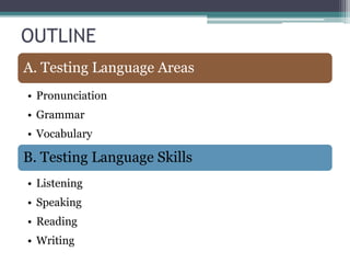 The document discusses various methods for testing different areas of language on a language exam, including pronunciation, grammar, vocabulary, listening, speaking, reading, and writing. It provides details on limited response tests, multiple choice tests, reading aloud, and cloze tests as ways to assess pronunciation and grammar. For each method, it outlines the advantages and limitations, such as being easy to prepare but time consuming to score, or providing good control but not directly measuring conversational skills. The goal is to select methods that best evaluate students' language abilities in a valid and reliable manner.