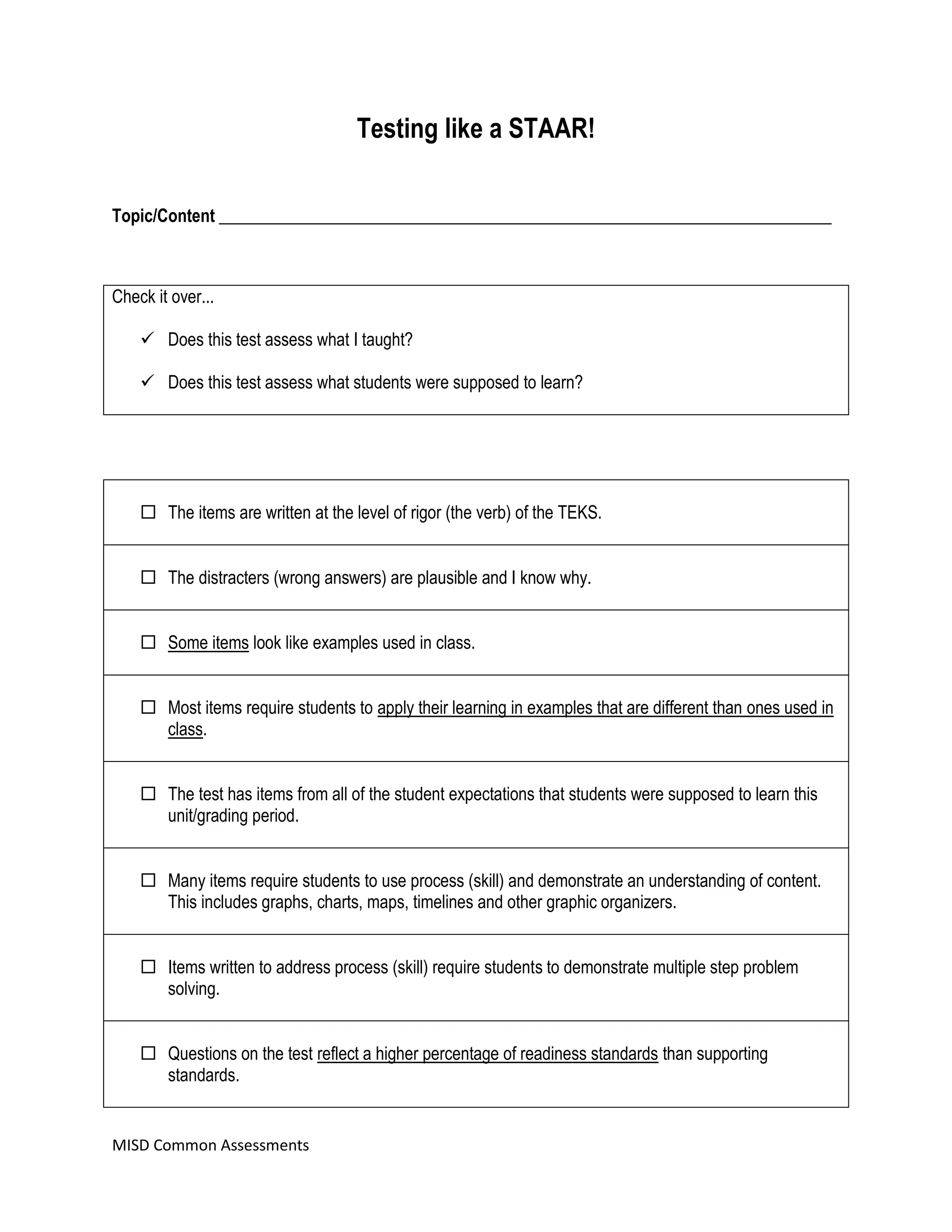 This document provides guidance for ensuring a test is properly aligned to what was taught to students. It recommends checking that the test assesses the intended Texas Essential Knowledge and Skills (TEKS), that distractors are plausible, and that most items require students to apply their learning in new examples. The test should include items addressing all student expectations covered, and many items should require students to use skills and demonstrate understanding of content, including through graphic organizers.