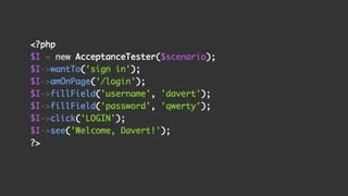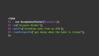The document discusses different types of software testing including acceptance testing, scenario based testing, user stories, acceptance criteria, functional testing, and unit testing. It explains that testing improves reliability, increases coverage, and combats technical debt while boosting team morale. Unit testing is the fastest but hardest to write while acceptance testing is the easiest to write but slowest and hardest to debug. User stories follow the format of "As a <user> I want <goal> so that <benefit>" and acceptance criteria use "Given <condition>, when <action>, then <result>" format.