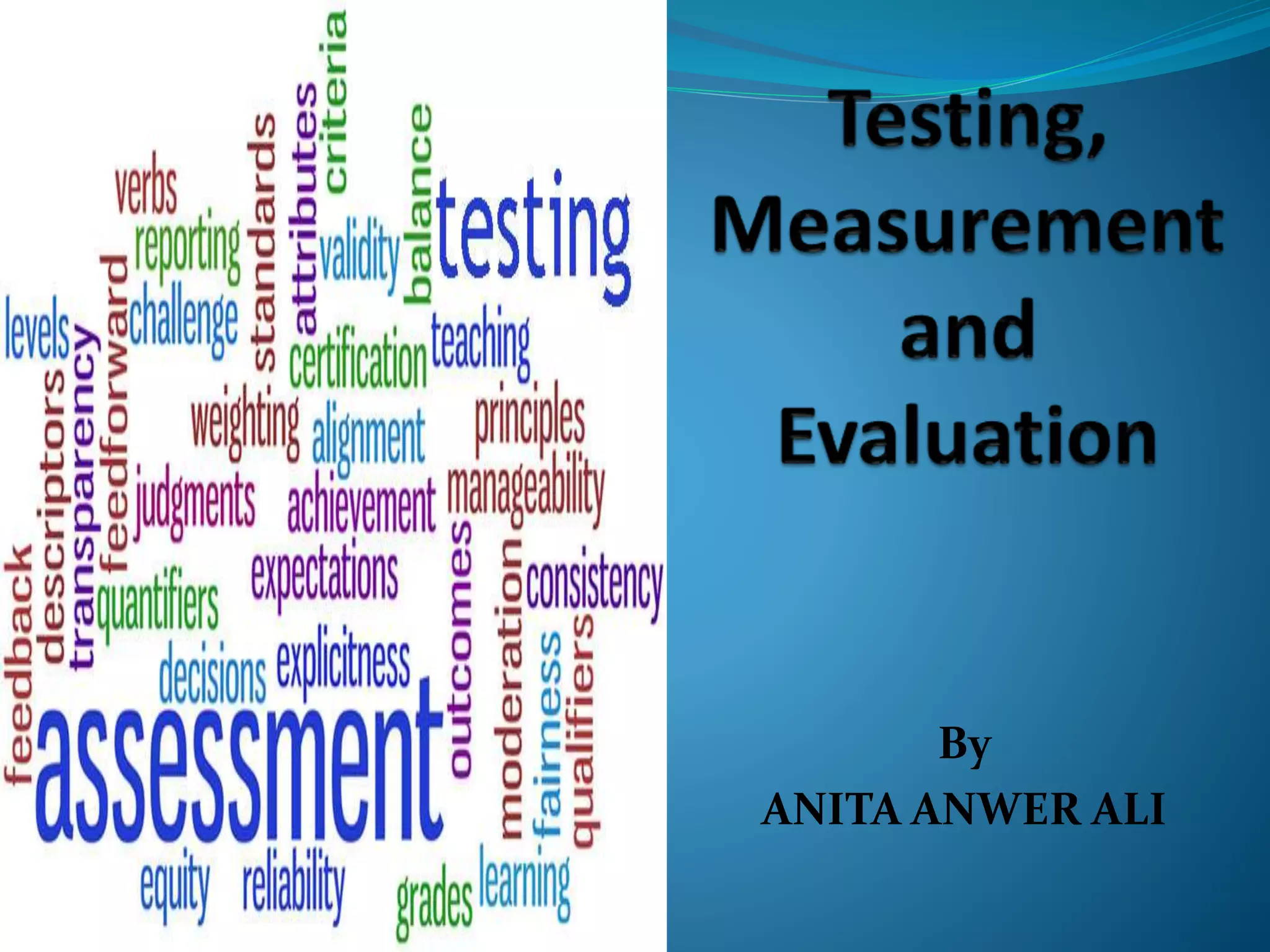 The document discusses the importance of testing, measurement, and evaluation in education, emphasizing their roles in assessing student abilities and progress. Testing is defined as a systematic procedure to evaluate individual performance, while measurement quantitatively describes traits, and evaluation qualitatively assesses whether educational objectives have been met. It contrasts measurement and evaluation, noting that measurement provides numerical data, whereas evaluation involves subjective judgments about quality and improvement.
