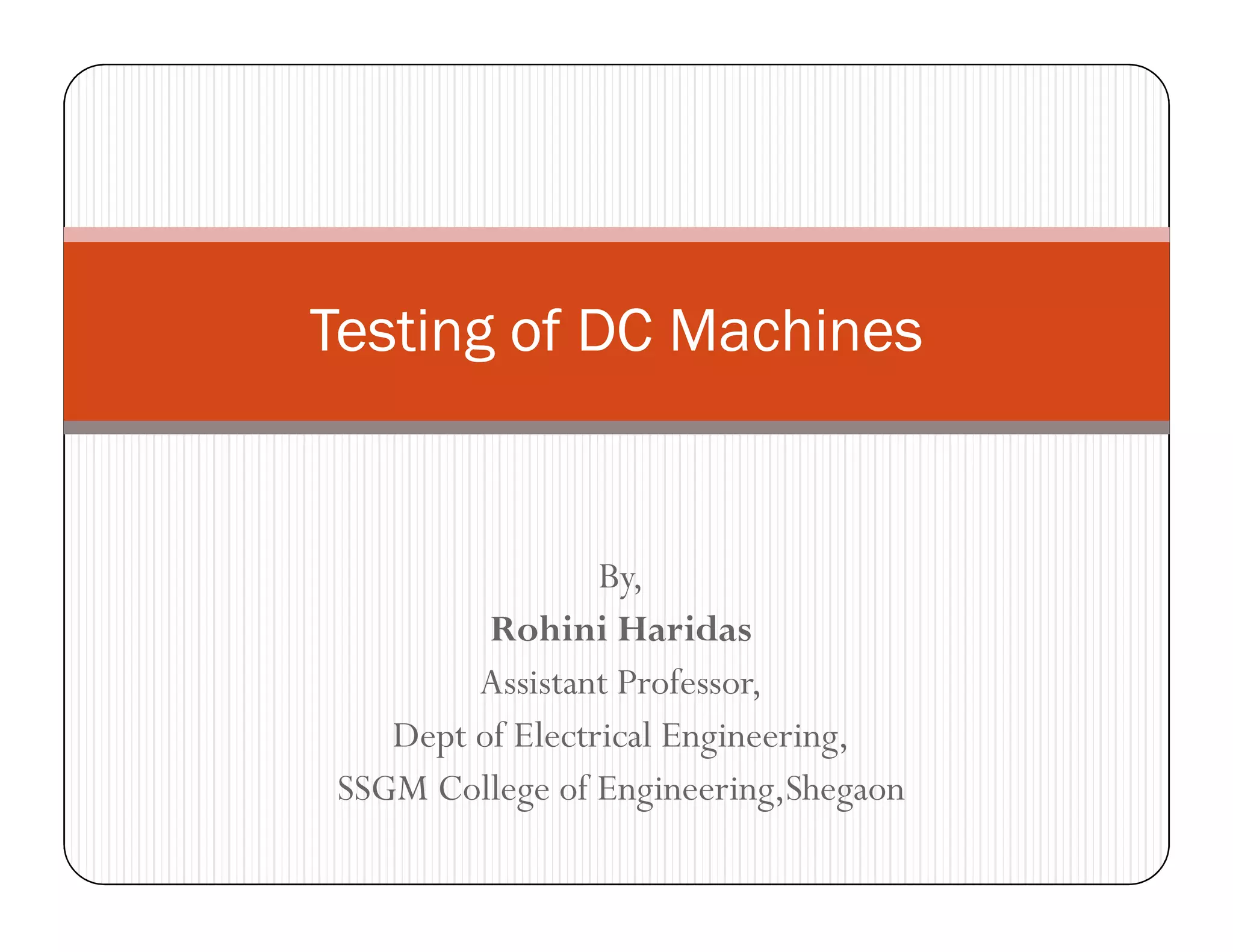 This document discusses different methods for testing DC machines. It describes the objectives of testing as determining if a machine's performance matches its design specifications and investigating any variations. Three main testing methods are outlined: direct, indirect, and regenerative. The direct method involves directly loading the machine and measuring efficiency. The indirect method determines performance characteristics from no-load test data using methods like Swinburne's test. Swinburne's test involves running the machine at no-load and recording parameters to calculate constant and stray losses. Examples of calculations for torque, output, and efficiency using data from brake tests are also provided.