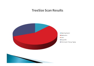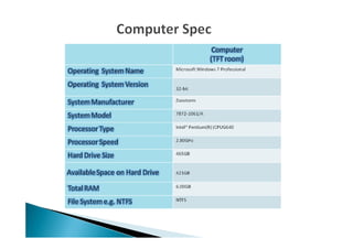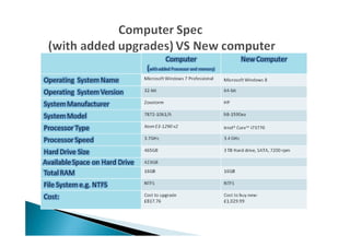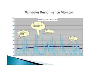The document discusses testing the performance of several computers using Windows Performance Monitor and TreeSize software. It includes details of tests run on one computer to check processor and memory usage under normal browsing conditions. The results found the processor peaked at 66% during Photoshop use but was generally lower than expected, while memory increases were small. Upgrading the computer's memory and processor is recommended over buying a new system based on the lower cost of upgrading. Regular performance monitoring is advised to optimize computer usage and efficiency.