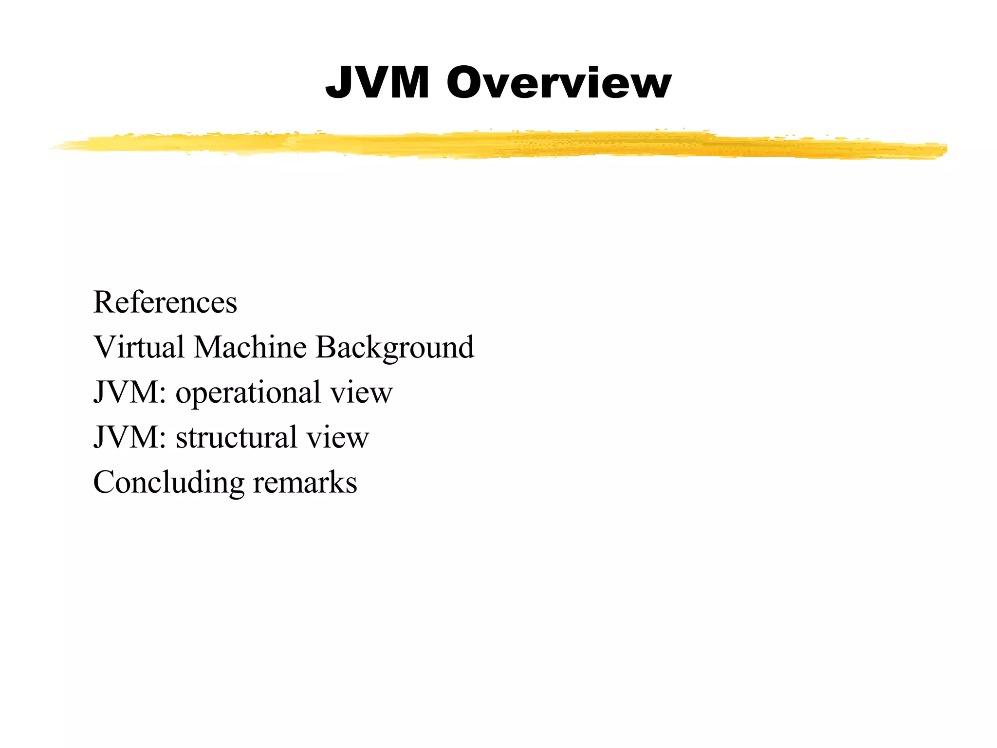 - It discusses the operational view of how the JVM loads, links, executes and exits from a Java program. This includes class loading, linking, initialization and object lifetime.