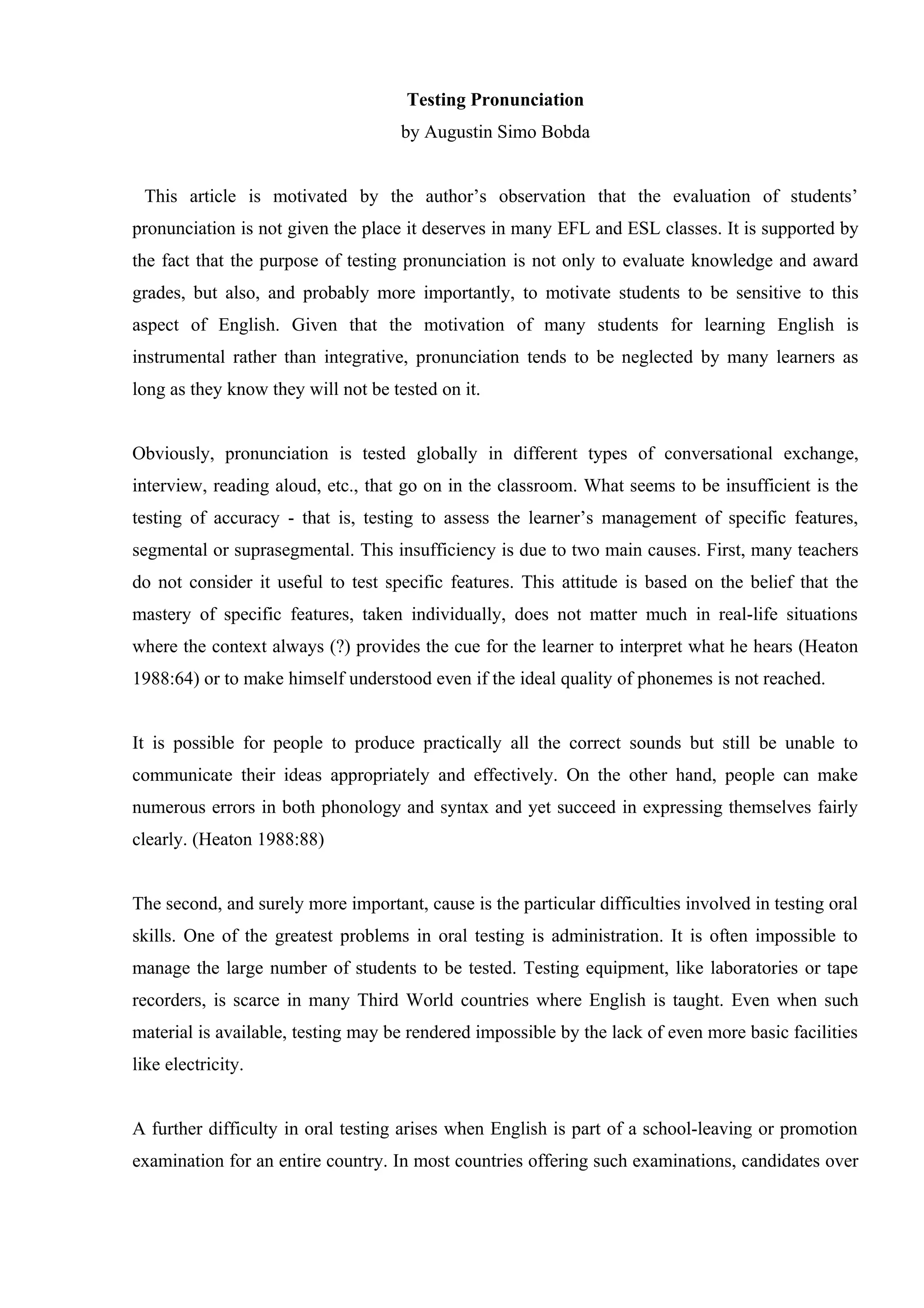 This document discusses testing students' pronunciation in English as a foreign language. It notes that pronunciation is often neglected in EFL/ESL classes despite its importance for communication. The author explores various methods for testing pronunciation, including dictation exercises, segment discrimination tests using pictures or words, and color-coded cards to test phonological alternations. While listening tests are ideal, alternatives are suggested when logistics make listening tests difficult, such as in high-stakes nationwide exams. The goal is to motivate students and evaluate their mastery of specific pronunciation features.