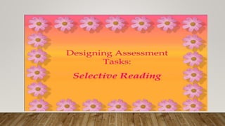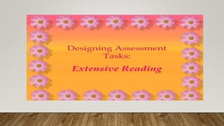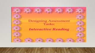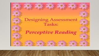 The document discusses various aspects of reading assessment, including different genres, skills, strategies, and types of reading. It describes two primary hurdles for becoming efficient readers as mastering bottom-up and top-down processing strategies. Several microskills and macroskills for reading are identified. Common strategies for reading comprehension include using prior knowledge, predicting, identifying main ideas, questioning, and making inferences. The types of reading discussed are perceptive, selective, interactive, and extensive reading.