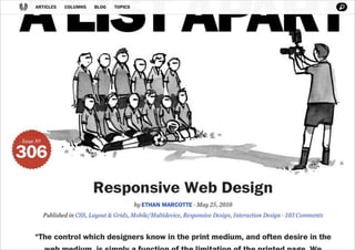 The document discusses various tools and techniques for testing responsive web design, highlighting the importance of testing during the design and development phases. It covers services like BrowserStack and emulators for real device testing, as well as debugging tools for different browsers and platforms. Additionally, it emphasizes the need for effective performance testing and considerations for budget in testing workflows.