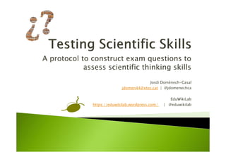 The document discusses a protocol developed to construct exam questions that effectively assess scientific thinking skills in students, addressing the observed lack of inquiry-based activities in classrooms. It highlights various scientific thinking categories, such as conceptual, procedural, and epistemic skills, and emphasizes the need for sustainable assessment methods. Additionally, it presents a structured approach using sequence starters to help teachers formulate better questions aligned with these skills.