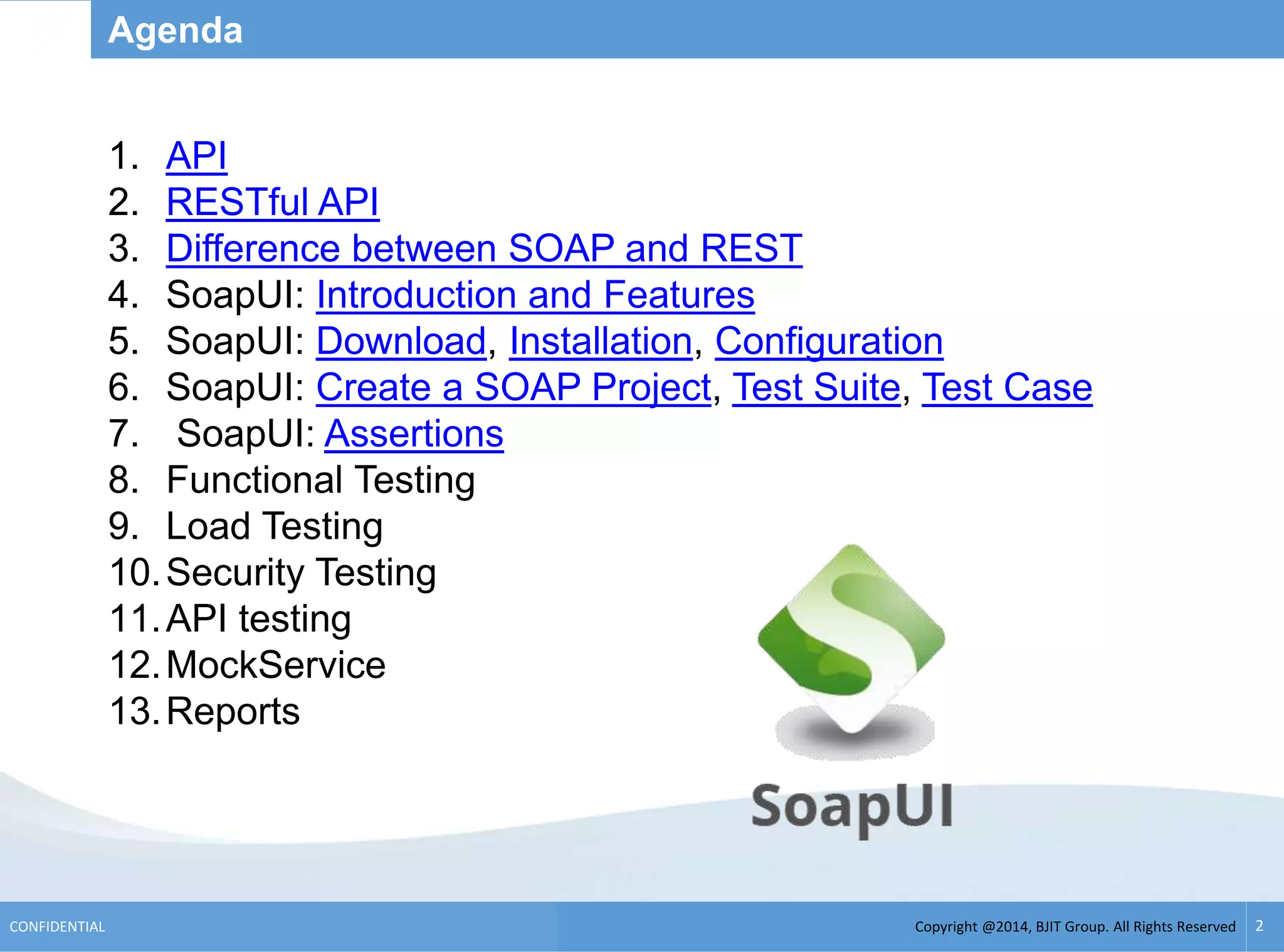 The document provides an overview of API testing using SoapUI, covering the differences between SOAP and RESTful APIs, and detailing the features and installation process of SoapUI. It includes sections on functional, security, load testing, and the creation of projects, test suites, and test cases within SoapUI. The document is designed to facilitate knowledge sharing on best practices for API testing and the effective use of SoapUI.