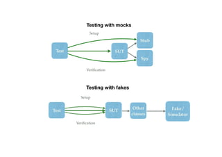 The document discusses different strategies for testing software, including testing with mocks and fakes, as well as types of tests like unit, integration, contract and system tests. It also covers types of external dependencies applications may have like read/write to databases, and challenges of testing with external adapters like availability and speed issues.