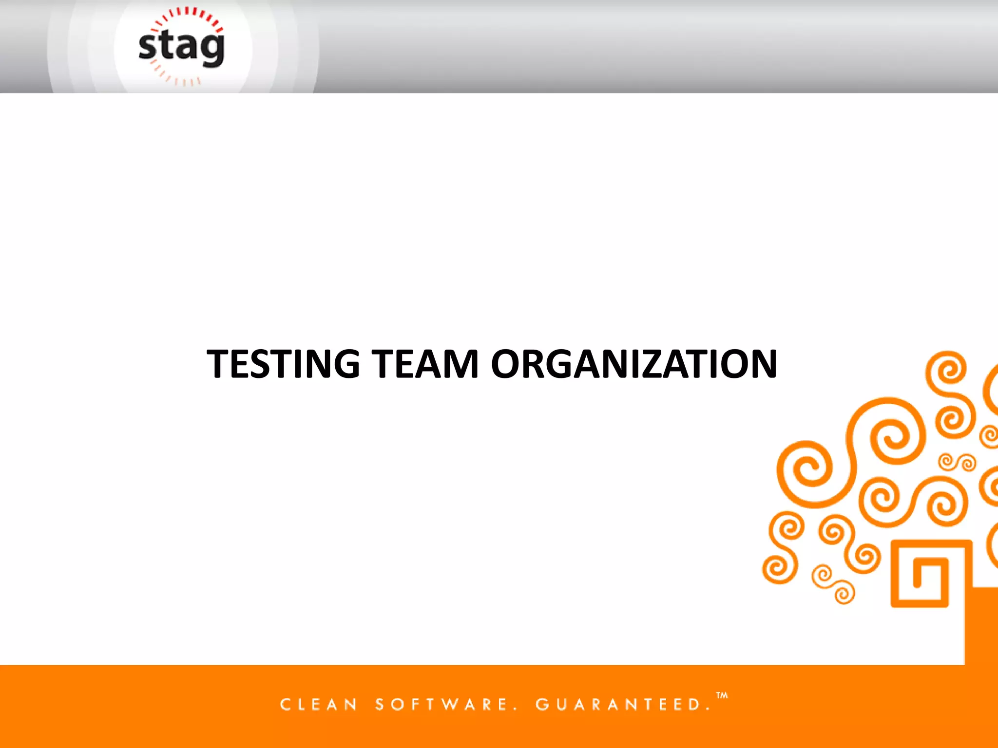 The document discusses different models for organizing software testing teams: just-in-time, entry as test engineer, policy-driven, testing and development under one manager, and independent testing team. It outlines the beliefs of organizations that use each model and potential issues with each, such as lack of core testing skills, high attrition, and conflicting priorities between teams. The document concludes that independent testing teams are becoming more common and that test engineering is growing as a recognized field of study.