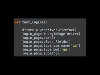 3. Behavior-driven development (BDD) using Lettuce to write tests with a given-when-then structure and integrate with Request and Selenium tests.