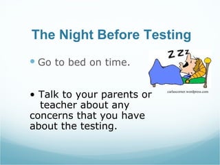 1) Prepare the night before by relaxing, getting a good night's sleep, and discussing any concerns with parents or teachers. 2) Start the test with a positive attitude by eating breakfast and thinking about relaxing activities after the test. 3) During the test, carefully read and follow directions, pace yourself to answer all questions, and use strategies like process of elimination and underlining key words.