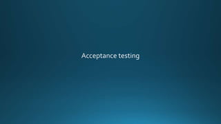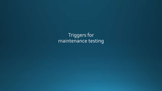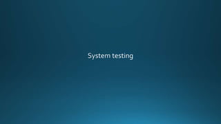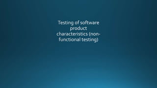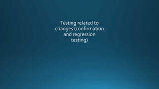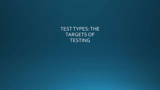 The document discusses various software development models and testing approaches. It describes the V-model development lifecycle and iterative development models. It then covers different levels of testing - component, integration, system, and acceptance testing. It also discusses different types of testing like functional, non-functional, structural, regression and maintenance testing. The purpose of classifying different test levels and types is to have a clear and comprehensive approach to software testing.