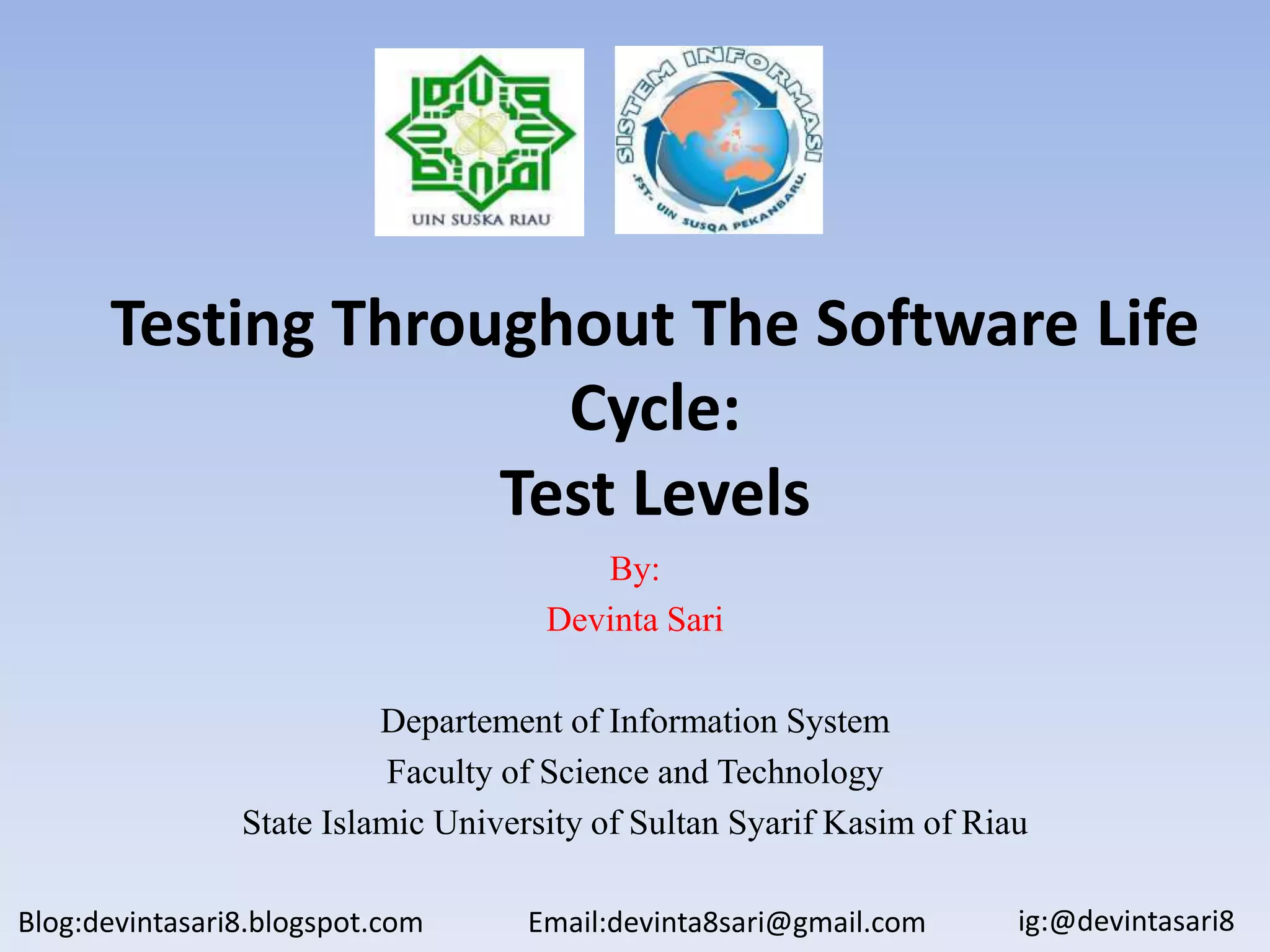 Component testing verifies individual software components and modules in isolation from the rest of the system using stubs and drivers. Integration testing tests interfaces between components and interactions between systems. System testing evaluates the entire system against requirements and from the perspective of end users. Acceptance testing is conducted by customers or users to determine if the system is fit for purpose prior to deployment.