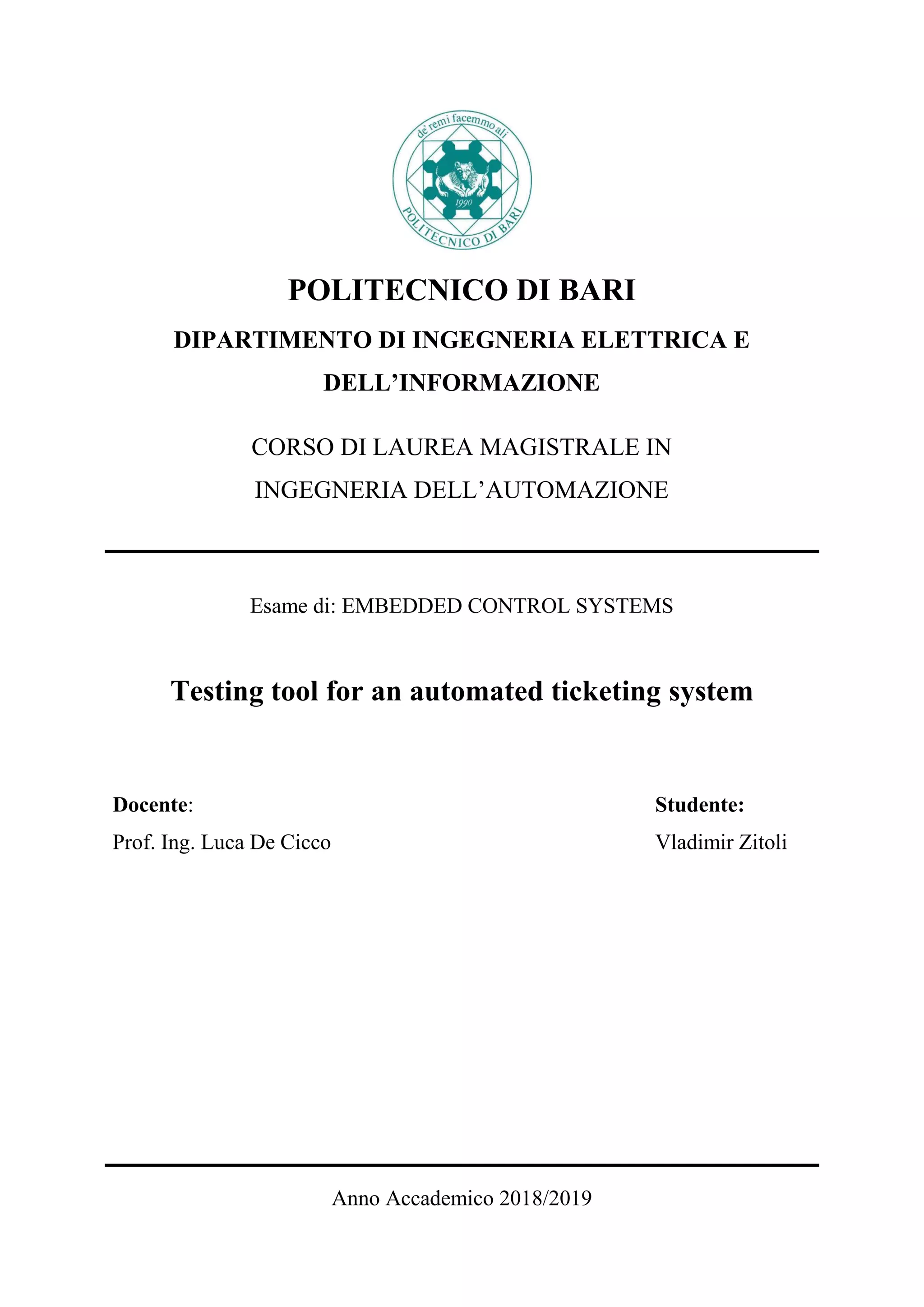 This document describes a testing tool for an automated ticketing system. The tool uses a stepper motor controlled by a microcontroller to vary the height of QR codes being scanned by an obliterating machine. The microcontroller firmware implements TCP/IP communication using LwIP to query the machine and check the scan results. It initializes the stepper motor driver, establishes the network connection, and enters a query-response loop to test the machine's performance at different code heights.