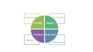 The document outlines the types of functional and non-functional testing in software development, detailing various methods including unit, integration, system, and acceptance testing, among others. It explains the purpose and process of each testing type, highlighting differences between functional requirements (what the product does) and non-functional requirements (how well the product performs). Additionally, it covers aspects such as usability, performance, security, portability, localization, and installation testing.