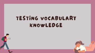This document outlines the importance of assessing vocabulary knowledge in language learners to enhance communication and academic success. It details various types of vocabulary knowledge tests, including receptive and productive assessments, and provides examples and instructions for constructing these tests. The document emphasizes the need for varied testing methods to address different aspects of vocabulary understanding and production.