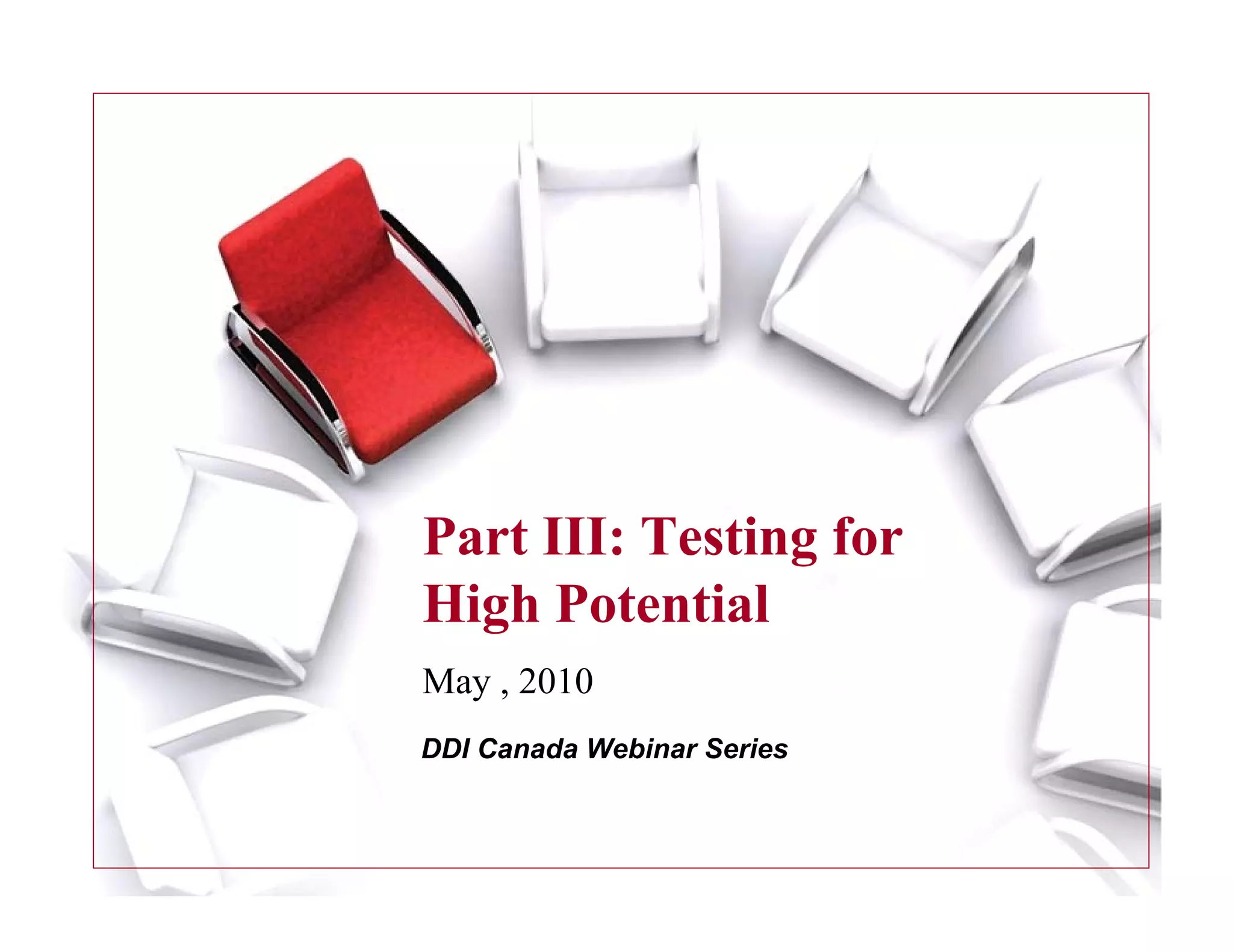 The document discusses DDI's webinar on testing for high potential. It outlines DDI's experience in assessments and client satisfaction. It then discusses forces affecting one company, including an aging workforce and culture change. The rest of the document provides details on DDI's three-part approach to identify and develop high potential talent: 1) determine capacity needs, 2) identify high potential employees, and 3) assess gaps and develop employees. Various charts and examples are provided to illustrate DDI's methods.