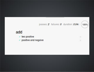 The document discusses using the Mocha testing framework for JavaScript. It covers Mocha features like BDD/TDD syntax, using assertion libraries like Chai, and testing asynchronous code. It also provides examples of setting up tests in Node.js and the browser using Mocha and integrating tests with build tools like Grunt and Gulp.