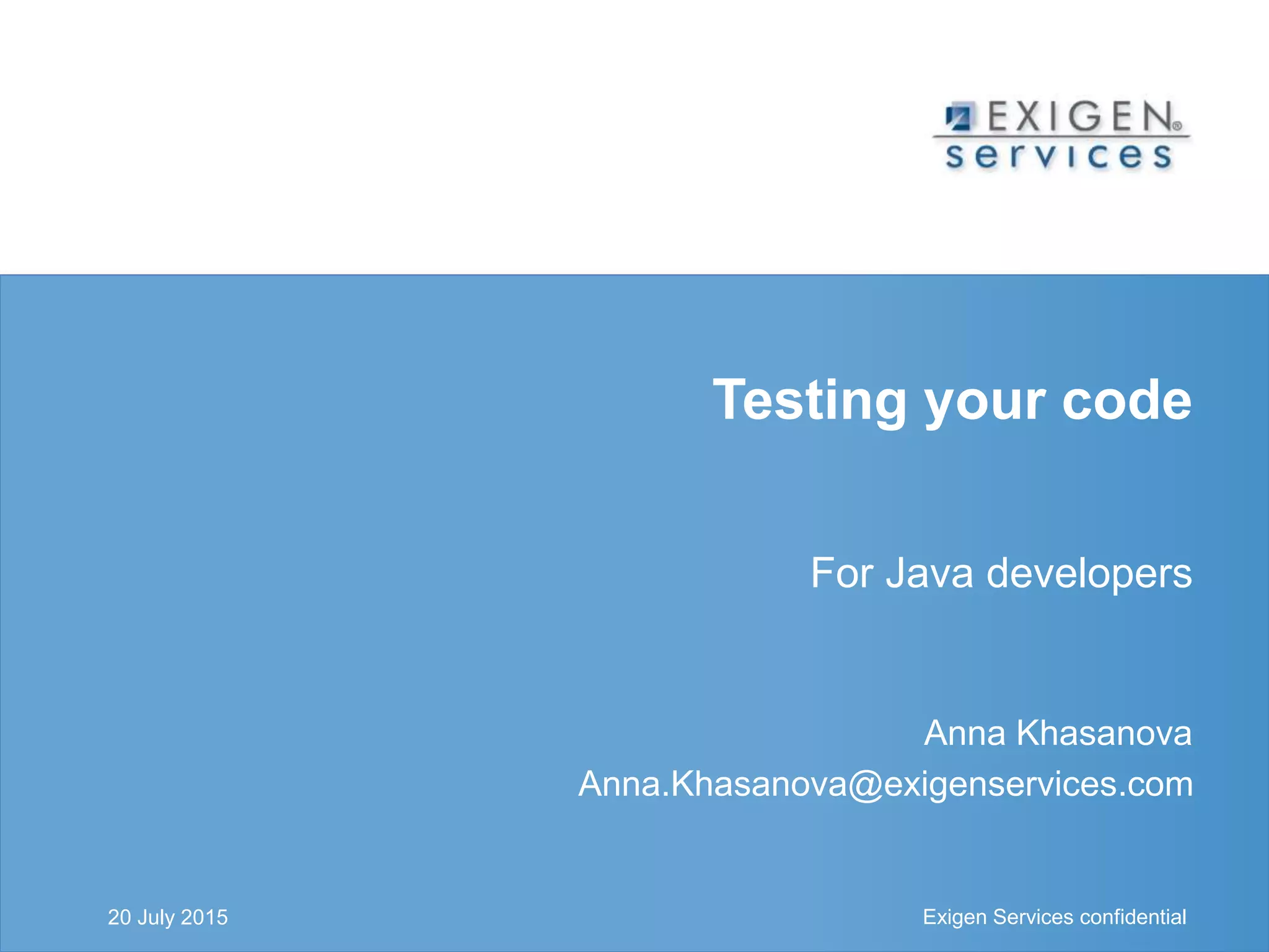 The document discusses testing Java code using test-driven development (TDD). It covers TDD basics like writing tests before code, unit testing individual functions, and automatically running tests frequently. It provides examples of how to structure unit tests with arrangements, actions, and assertions and use mocking to isolate dependencies. Guidelines are given for writing testable code and utilizing features of testing frameworks like parameterized tests, expected exceptions, and matchers.