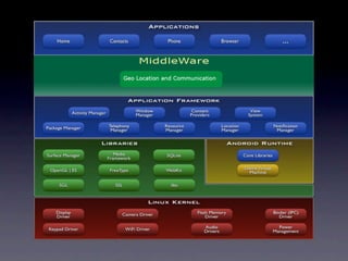 This document proposes a framework for mobile platforms that provides geo location and peer-to-peer communication services. It aims to develop libraries that allow developers to access location data and enable Bluetooth communication between nearby devices. The framework would include APIs for geo location, maps integration, and Bluetooth communication. It also outlines research conducted, the proposed solution, library components, and demo applications like Geoscribe and a Bluetooth chat room. The framework is intended to be portable across platforms and provide features like SOAP compliance, power management, and security customization.