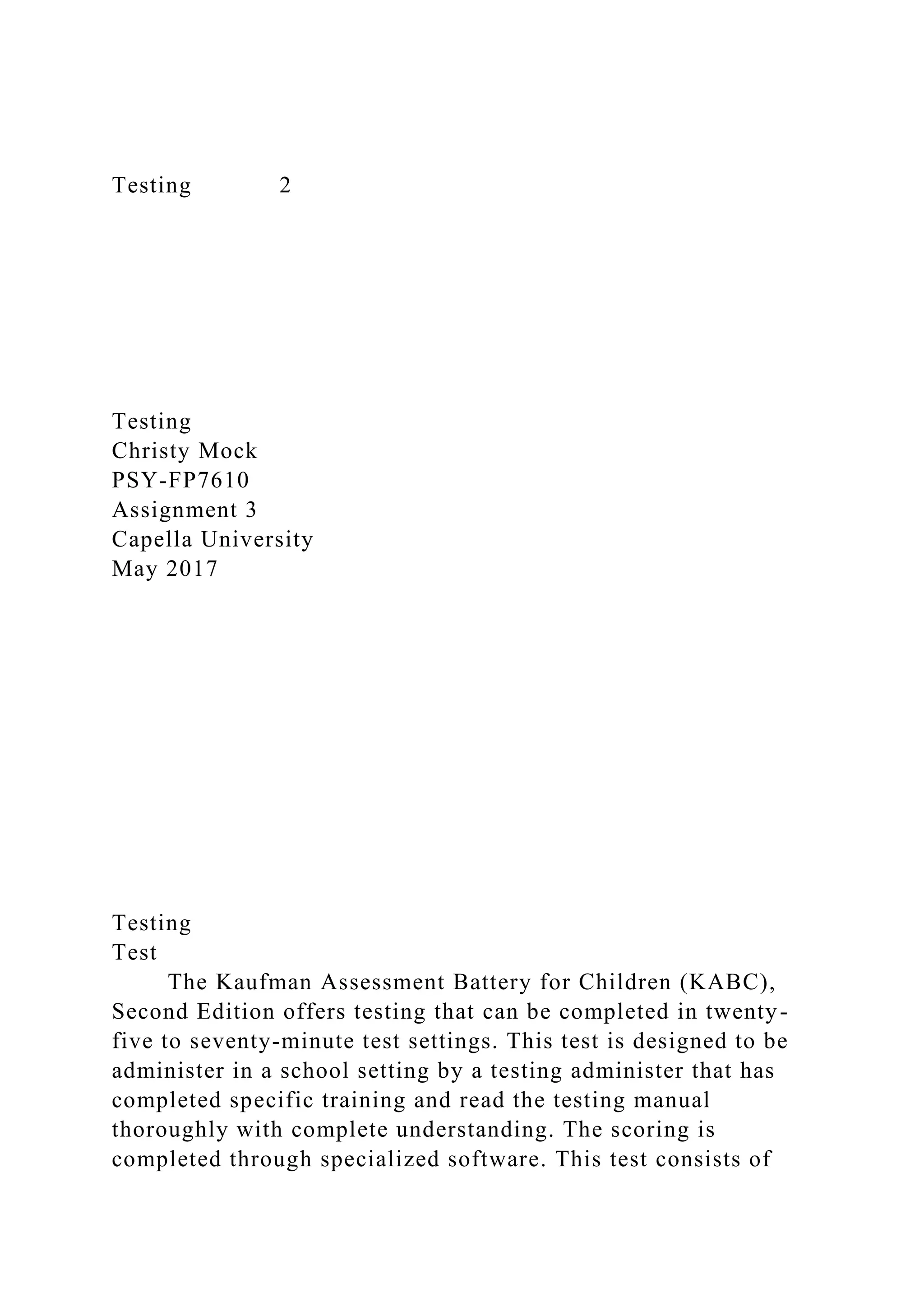 The document provides information about the Kaufman Assessment Battery for Children (KABC), Second Edition. It discusses the administration, scoring, subtests, and categories of the KABC-II. Reliability and validity evidence for the test is also reviewed. The document emphasizes following the National Association of School Psychologist's principles when administering the KABC-II to avoid bias and ensure ethical testing.