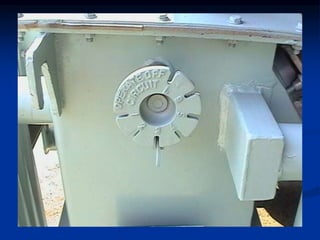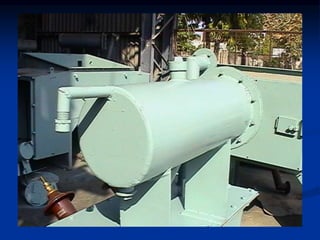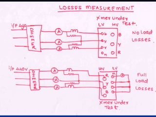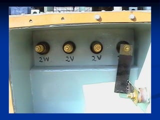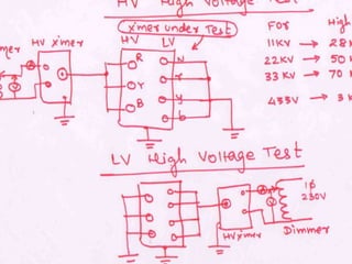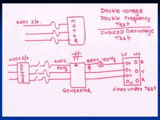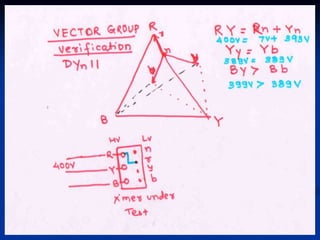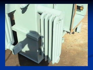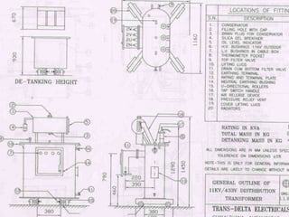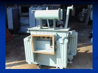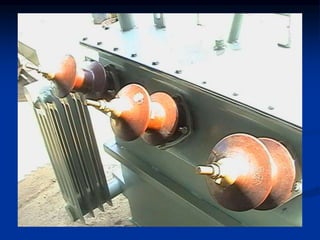 The document discusses distribution transformers, including what they are, their main features and parts, testing procedures, maintenance, and protection. Distribution transformers are used to transform power from higher voltages like 11kV to lower voltages like 433V for distribution. Routine tests are carried out on all transformers to check insulation, losses, and ratios according to national standards. Maintenance like checking oil quality and connections helps prevent failures from overloading, water ingress, or insulation issues.