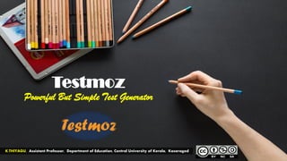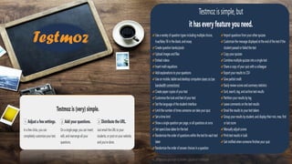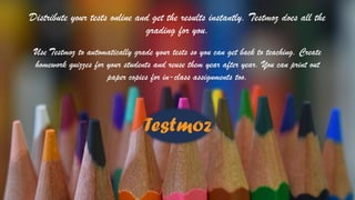 TestMoz is a simple yet powerful online test generator that allows users to create, distribute, and automatically grade tests for free with certain limitations. It enables educators to create quizzes and homework assignments that can be reused, while also offering options for paper copies. The process involves multiple phases, including test creation, question insertion, settings adjustment, and results publication.