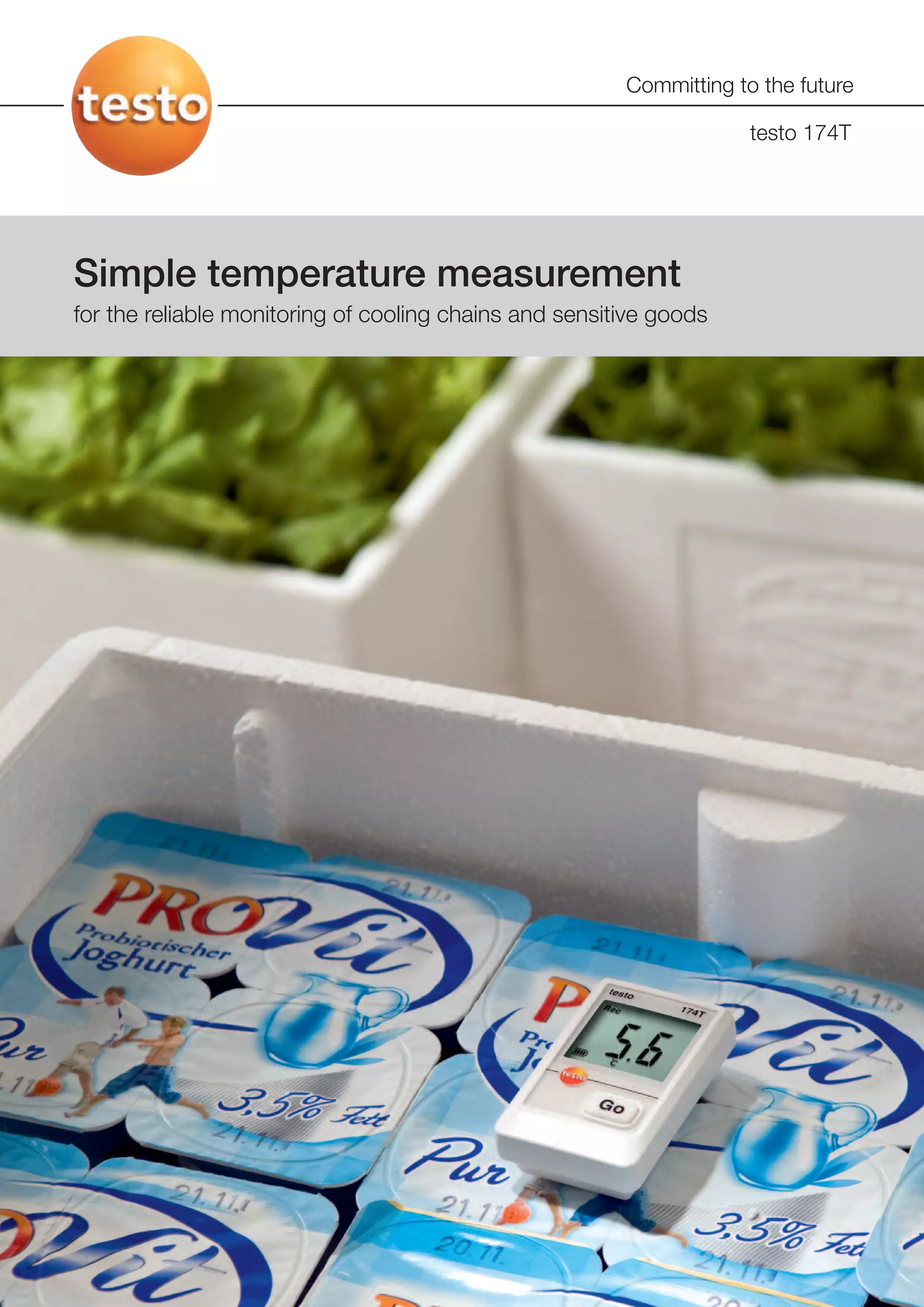 The testo 174T mini data logger is a compact, robust temperature logger ideal for monitoring cooling chains and sensitive goods. It has high data integrity, a large memory, IP65 waterproof rating, and alarm functionality. The logger easily connects to a PC via USB to configure it and analyze recorded temperature measurements over time using the ComSoft testo 174 software. Accessories include an interface for programming and readout, wall brackets, batteries, and calibration certificates.