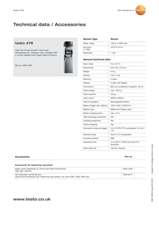 The document describes the testo 476 handheld stroboscope, which is used to measure and test rotation and vibration movements of fast-moving objects. Some key features include its high light intensity provided by a xenon flash lamp, a memory function to store the last measurement, a trigger input for synchronizing flashes, and a battery allowing over 2 hours of continuous operation without mains power. It has a wide measurement range of 30-12,500 rpm with high accuracy and resolution of 1 rpm.