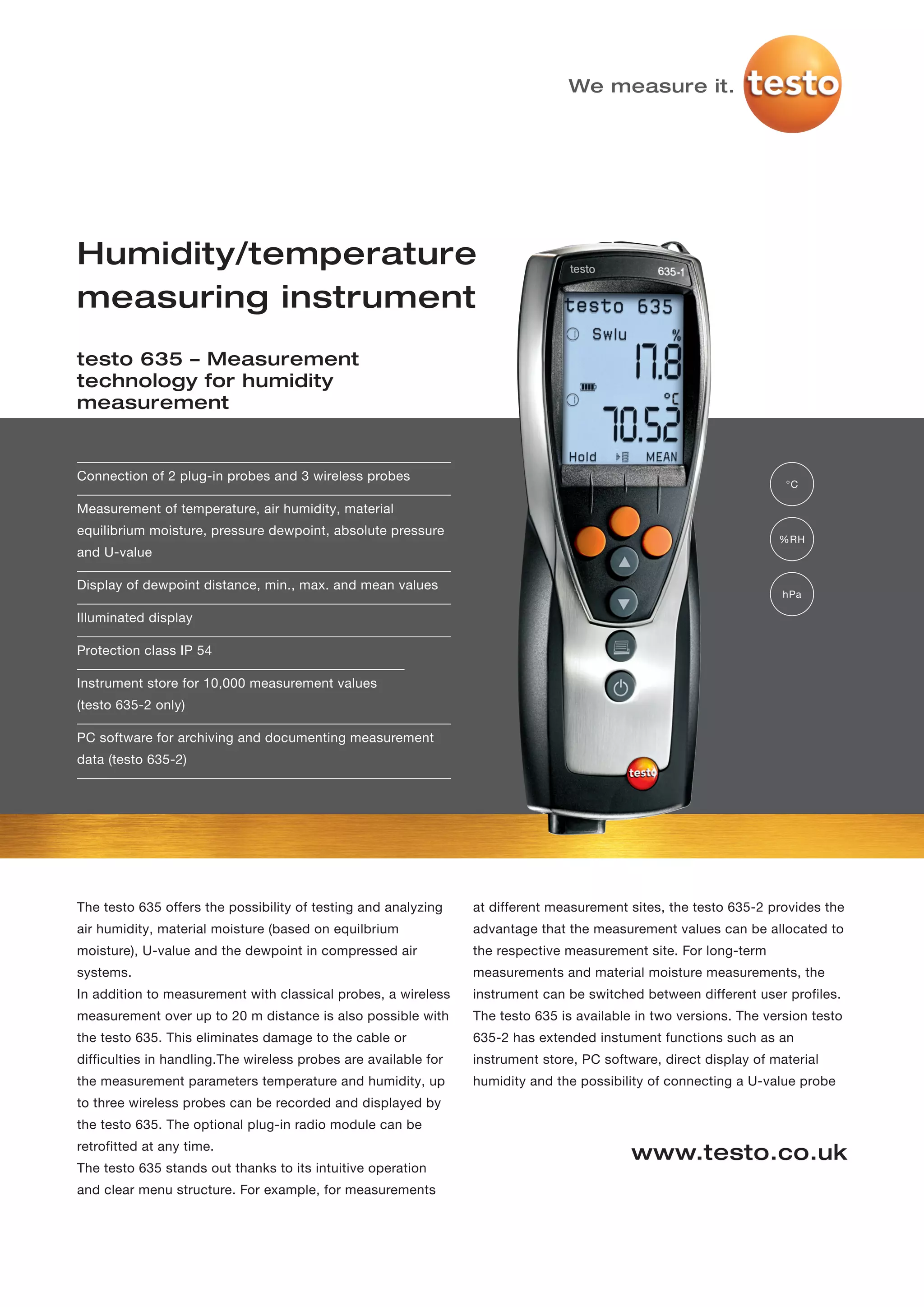 The document provides information on the testo 635, a humidity and temperature measuring instrument. It can measure temperature, humidity, dew point, pressure and material moisture. It has an illuminated display and can store up to 10,000 measurement values. The testo 635-2 model adds functions like an instrument store, PC software, and the ability to connect additional probes. The testo 635 offers precise measurement of various parameters with intuitive operation.
