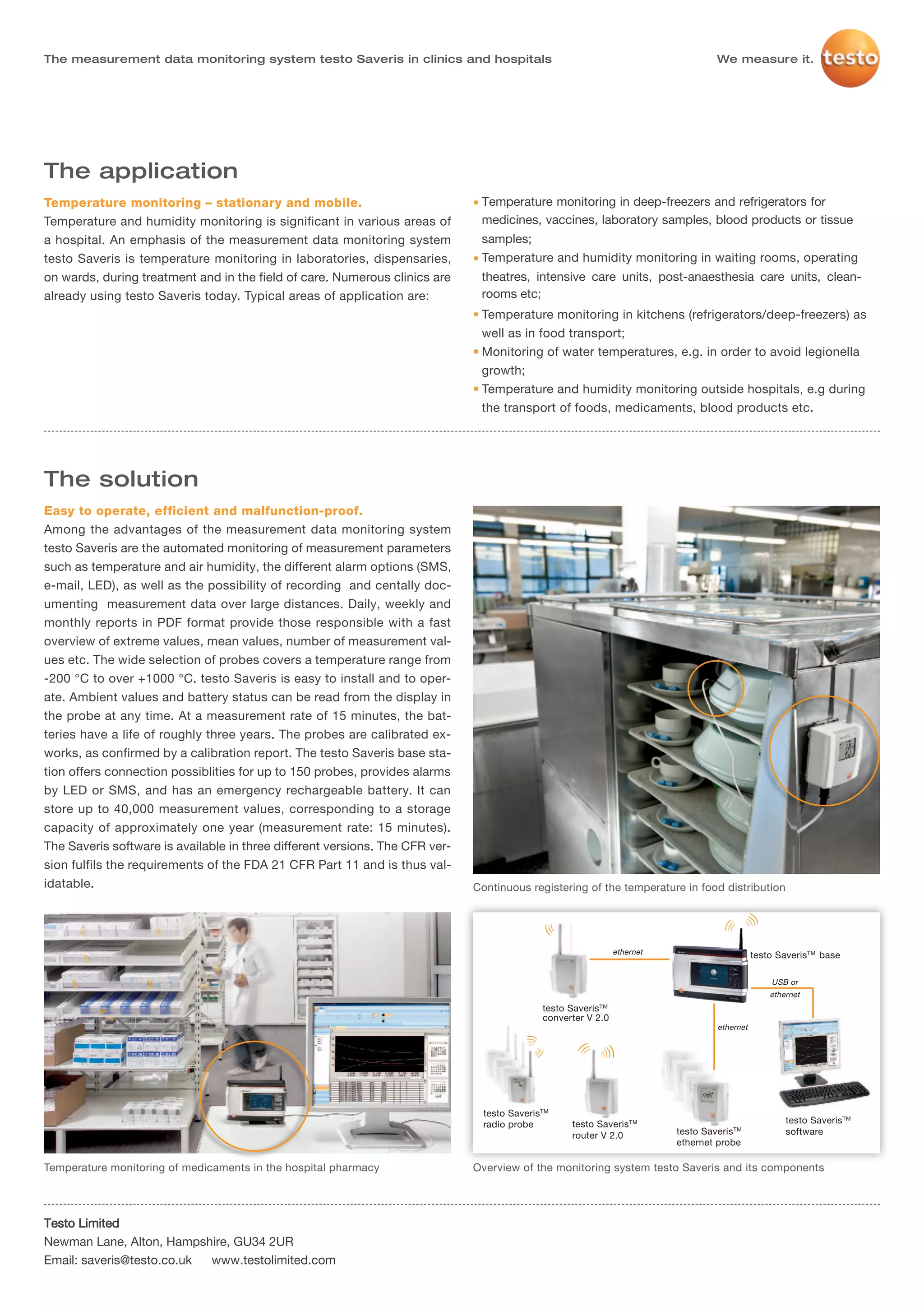 This document discusses the testo Saveris measurement data monitoring system for use in hospitals and clinics. It measures and records temperature and humidity values to ensure patient safety and product quality. Testo Saveris automatically monitors values, sends alerts for out-of-range readings, and generates reports to free up staff time. It can monitor temperatures in various areas like refrigerators, operating rooms, and during transport. The system is easy to use and reliably stores data for up to a year from hundreds of probes connected to a central base station.