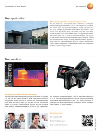 This document discusses thermography of large objects. It notes that it is not possible to capture very large objects in a single thermal image if the camera cannot be far enough away. The solution is to take multiple partial images and stitch them together into a panorama using Testo's panorama image assistant software. This allows the entire large object to be analyzed and documented in a single image rather than having to view and compare multiple separate images. The panorama assistant is available on the Testo 885 and 890 thermal imagers and provides both an overview and detail of large objects.