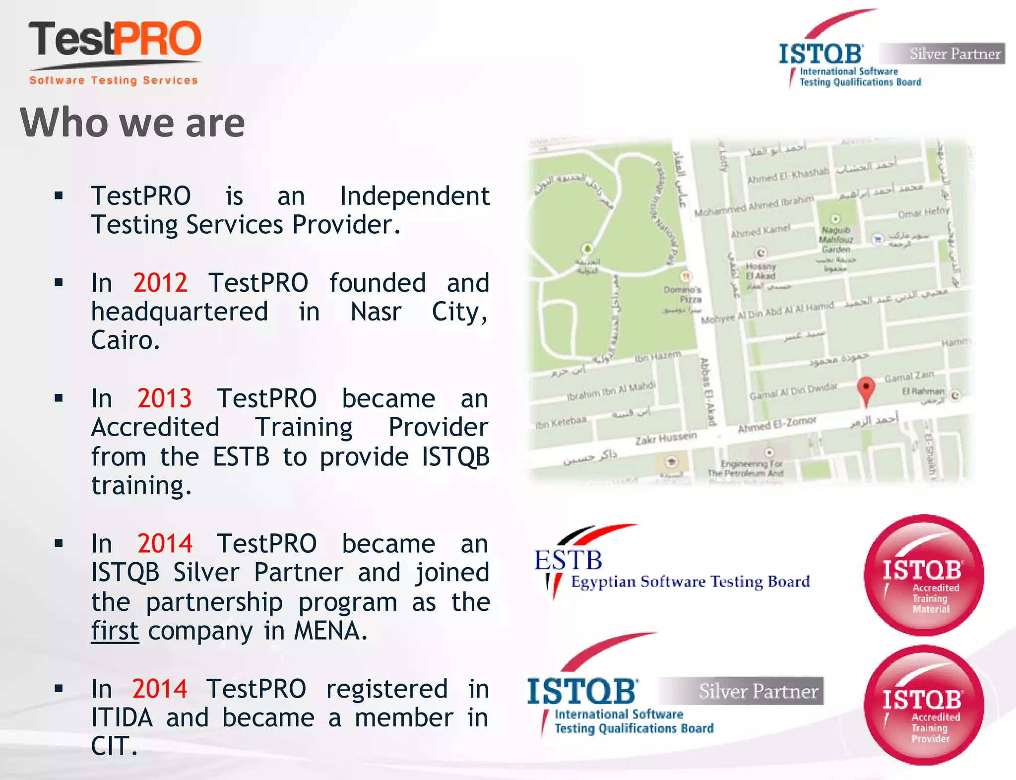 TestPro is an independent testing services provider founded in 2012, focused on software testing and training, becoming an accredited ISTQB training provider in 2013 and an ISTQB silver partner in 2014. The company offers a range of testing services including functional, performance, and security testing, emphasizing the importance of rigorous software testing to enhance user experience and satisfaction. With over 500 certified testers and extensive training programs, TestPro aims to deliver high-quality testing solutions tailored to client needs while addressing the challenges associated with software quality assurance.
