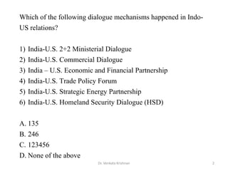 The document discusses India's strategic partnerships and relations with major powers like Russia, China, and the United States. It provides 31 multiple choice questions about various aspects of these relationships, including high-level dialogues, defense cooperation agreements, joint military exercises, trade relations and more. The questions are intended to test knowledge about India's foreign relations for exams like NET/UPSC.
