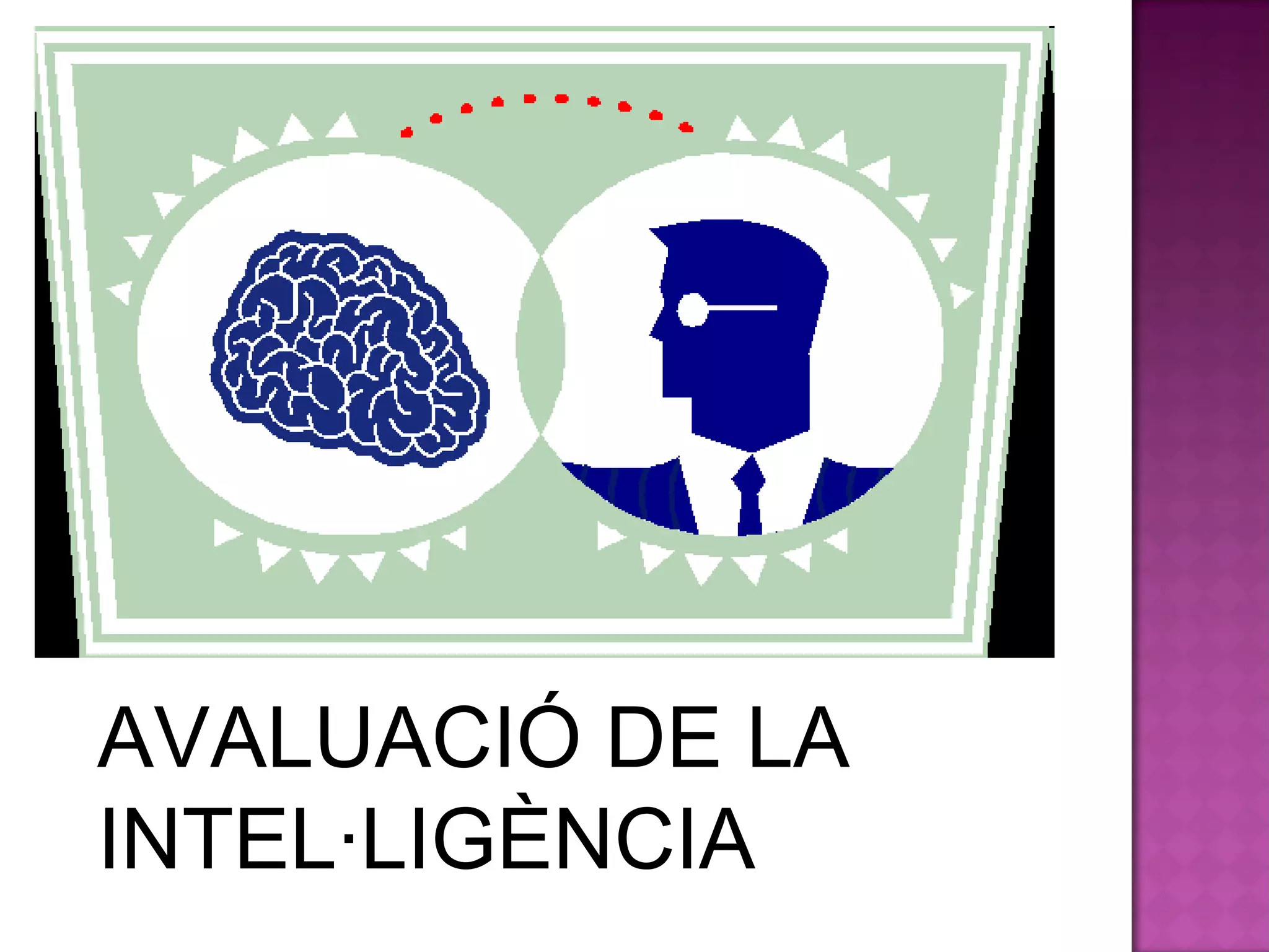 Quantificar el nivellde intel·ligència general o específic d’un subjecte Diagnosticar dificultats cognoscitives Ajudar a decidir opcions educatives i vocacionals AVALUACIÓ DE LA INTEL·LIGÈNCIA Proves de factor G/proves habilitats específiques Diagnosi de retard mental Orientació acadèmica/professional Són objecte de debat social i educatiu Han de ser vàlids i estandaritzats Han de ser aplicats per professionals